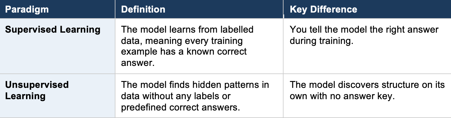 Unsupervised Learning works with unlabeled data. The model has no answer key. Instead, it discovers hidden structures, groupings, and patterns within the data on its own. This is invaluable when you do not know what you are looking for, or when labeling data is too expensive.