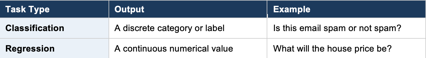 Supervised learning divides into two task types: