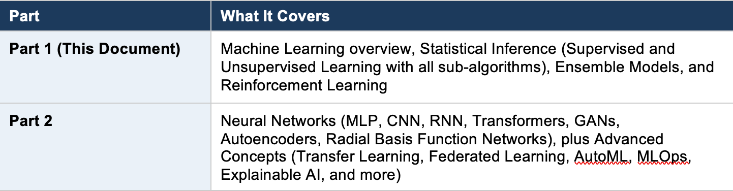 The ML ecosystem can be organized into several major branches. This two-part guide covers every concept from the taxonomy map, organized for easy reference: