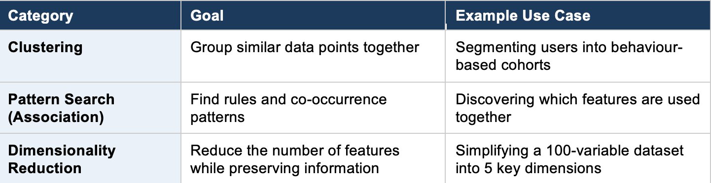 Unsupervised learning includes three major sub-categories:
