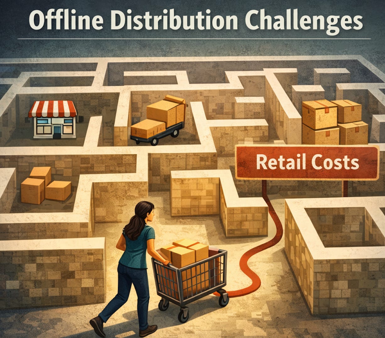 The problem. To reach mass-market consumers, most brands need an offline presence, including pharmacies, chemists, supermarket chains, and general stores. However, offline is capital- and logistics-intensive, as it involves distributors, sub-distributors, wholesalers, and rack-space deals. Each layer extracts margin; inventory sits in the system for months; retailers reject near-expiry SKUs. Short shelf-life SKUs (natural, preservative-light formulas) are particularly risky.