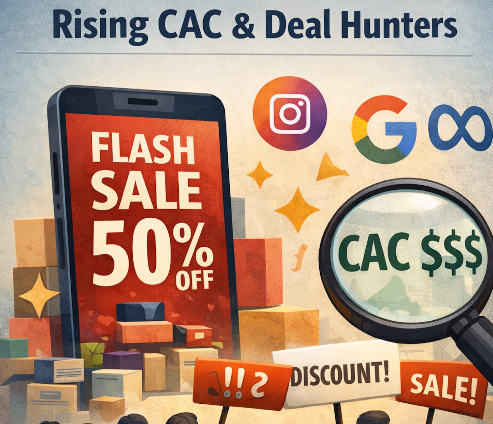 As more players bid, CPMs and CPCs rise. To keep conversion volume, brands increase discounting and run frequent promotions. The effect: CAC remains high, but net revenue per acquired customer falls (discounts reduce AOV), and the majority of customers do not return.