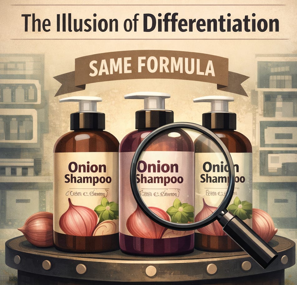 Evidence & mechanics. Industry reporting shows hundreds of contract manufacturers in the Indian BPC ecosystem, and examples of the same manufacturers producing SKUs for multiple brands. The consequence: ingredient trend-chasing (vitamin C, niacinamide, onion oil, exfoliating acids) leads to many SKUs feeling substitutable to consumers.