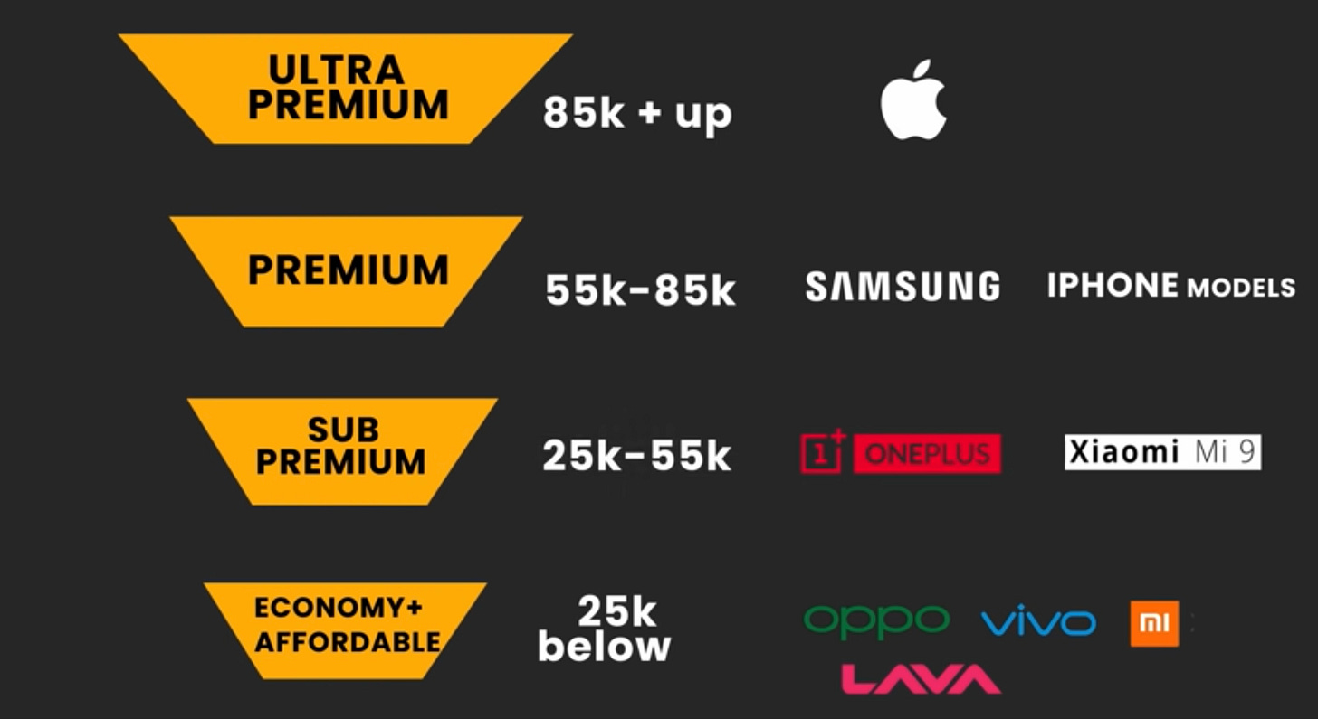 Now if you look at the pricing of phones in India back in 2019, you will see that iPhone was the costliest with the pricing of Rs.85K+, then we had Samsung S10 priced at Rs.55K+ and then straight away we had Oppo, Vivo, and other companies that were primarily focused on selling phones below Rs.25,000.