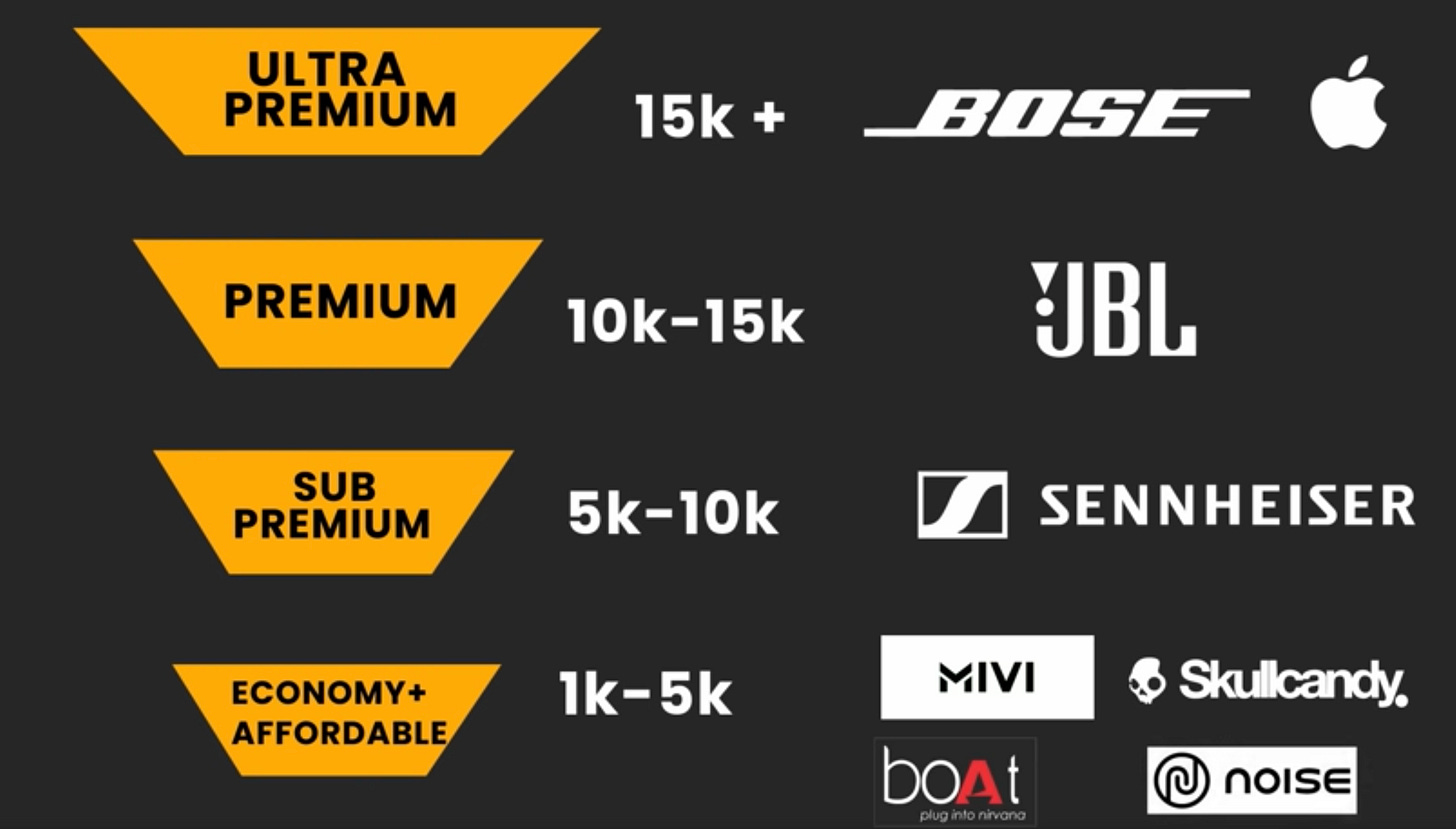 First, we had the ultra-premium wireless earphones category wherein we had Bose and Apple that had a base price of Rs.17K and Rs.15K respectively. Then in the premium category that is between Rs.10K to 15K, we had only JBL as a significant brand with its pod version being priced at Rs.10K. Then for sub-premium that is between Rs.5K to Rs.10K we had Sennheiser's wireless earphones that started from Rs.6,400 onwards and below this price point that is below 5000 there was no giant brand and yet there was a huge demand for wireless earphones in India.