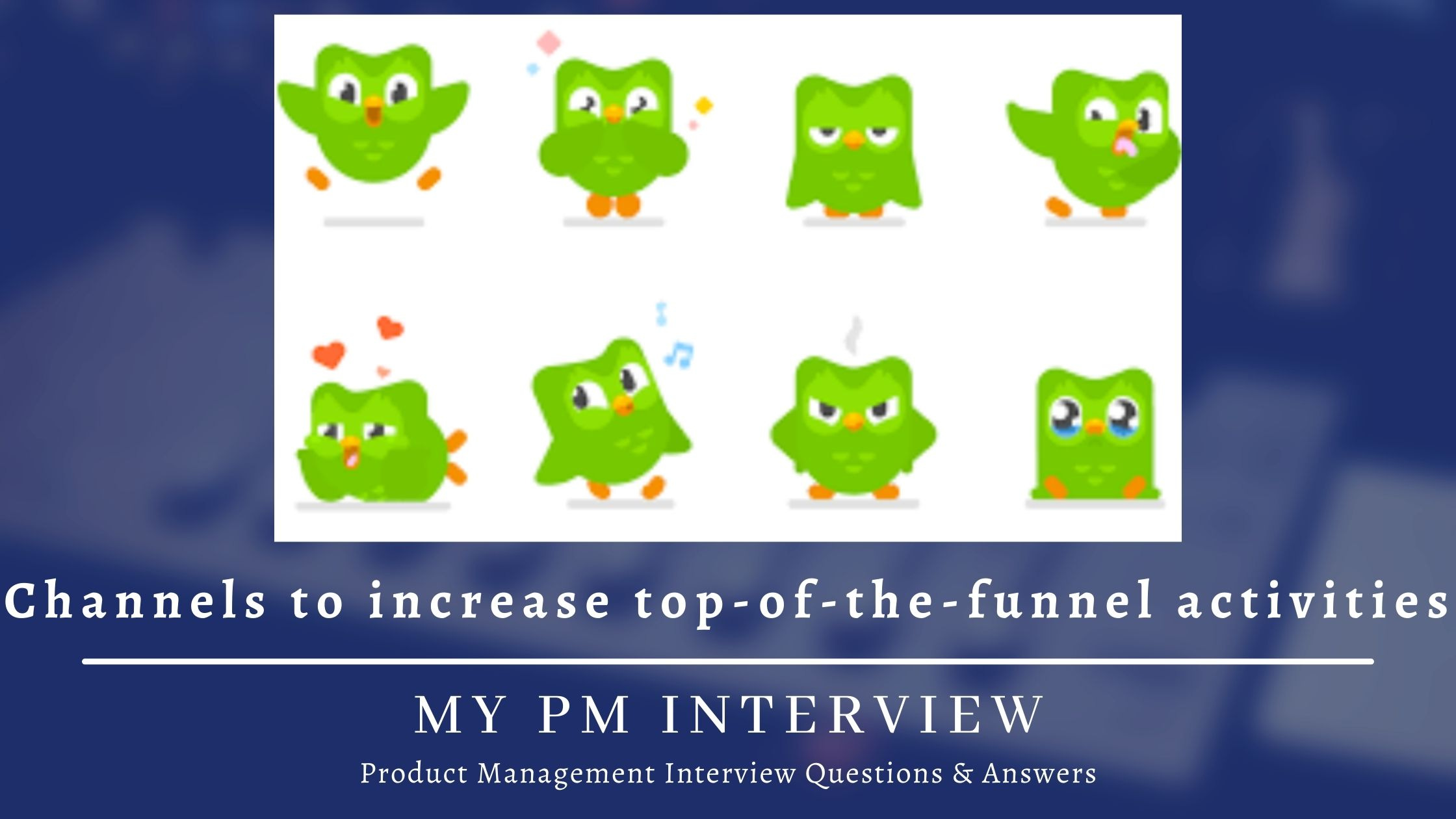 Which channels would you use to increase top-of-the-funnel activities for Duolingo? | Duolingo PM InterviewThis product management interview question tests your knowledge of growth marketing strategies.My PM InterviewDec 15, 2021∙ Paid5ShareThe interviewer is evaluating you on the following:Do you have a structured way of thinking?Are you able to empathize with users? Do you think about their goals and needs?Can you come up with multipl…Continue reading this post for free, courtesy of My PM Interview.Claim my free postOr purchase a paid subscription.PreviousNext