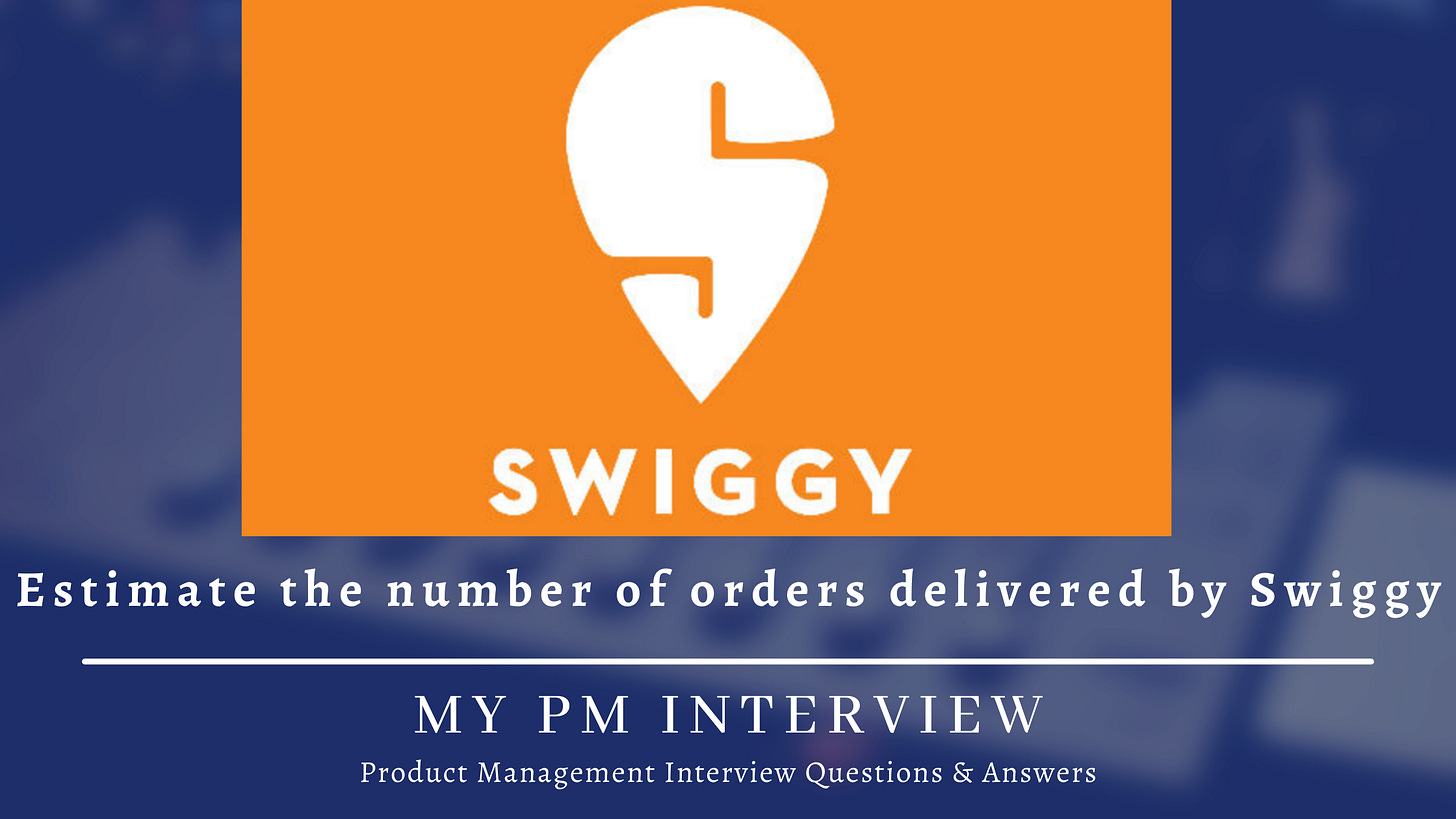 Estimate the number of orders delivered by SwiggyProduct Management Interview Question: Guess Estimate the number of orders delivered by Swiggy or Zomato per hour in IndiaMy PM InterviewMar 22, 2023∙ Paid101ShareIn product management interviews, it is common for interviewers to pose product estimation questions. These questions are designed to assess a candidate's ability to estimate various metrics, such as…This post is for paid subscribersSubscribeAlready a paid subscriber? Sign inPreviousNext