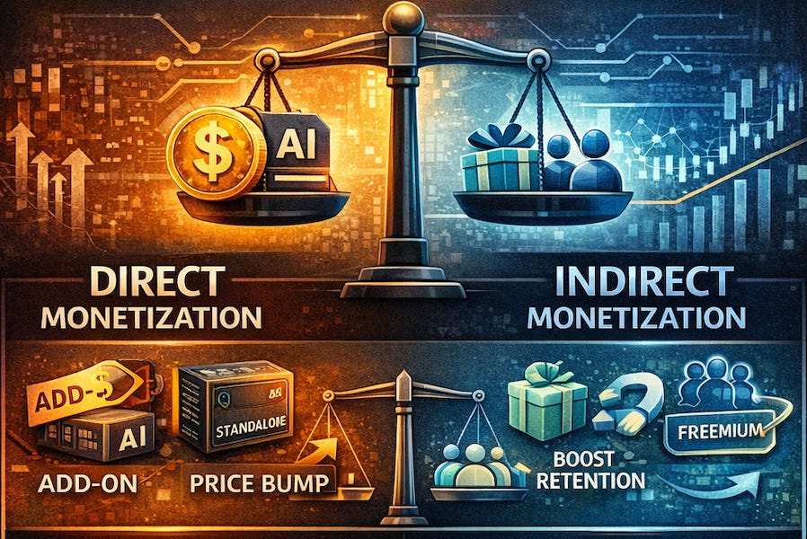 Direct monetization: You charge customers specifically for the AI capability (add-on, standalone product, or price bump).