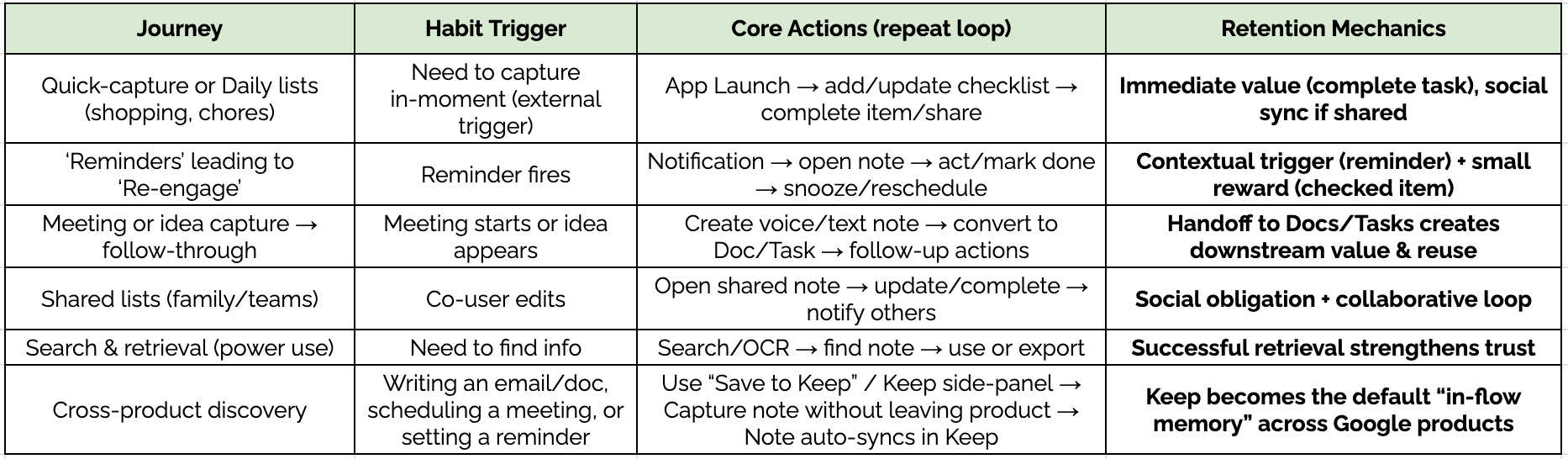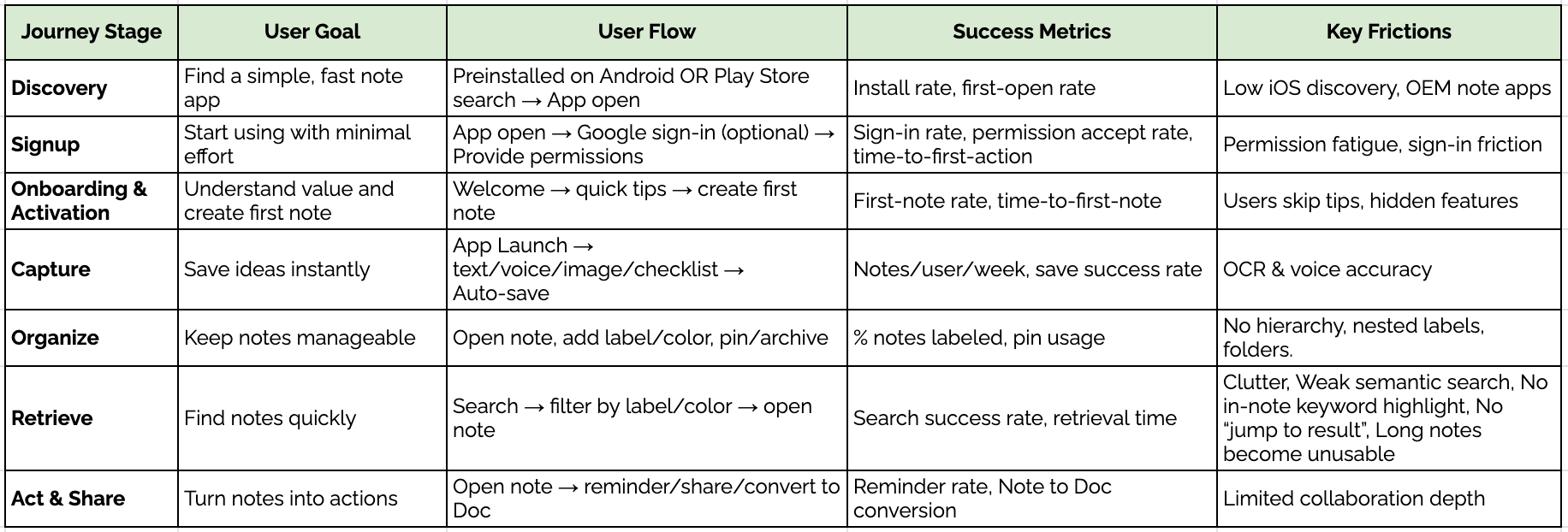 Google Keep works well for quick notes but doesn’t scale as users accumulate hundreds of notes. As note volume grows, users outgrow the product and migrate to tools like Notion or OneNote, leading to churn instead of long-term retention.