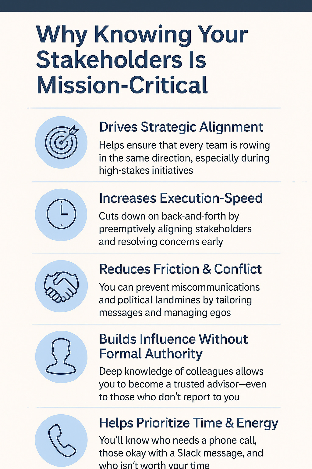 Understanding your stakeholders isn’t just about being informed—it’s your superpower for driving influence, accelerating execution, and creating seamless alignment. Here are five strategic reasons why this matters deeply: