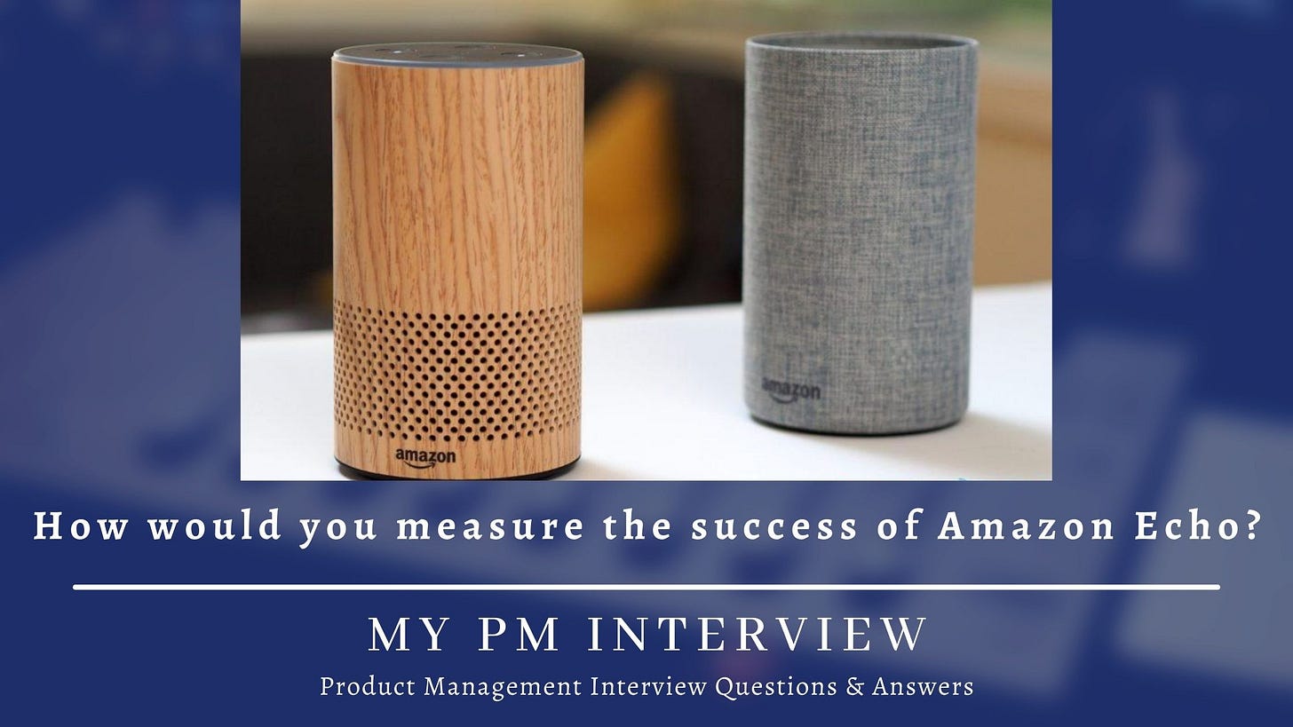 How would you measure the success of Amazon Echo? - Product MetricProduct Metric Question and Answer - How would you measure the success of Amazon Echo?My PM InterviewDec 12, 2021∙ Paid2ShareThe key to a product metric question is to start by defining what success means by identifying what the business goals are for the product. Once you have defined the objectives, think about what outc…This post is for paid subscribersSubscribeAlready a paid subscriber? Sign inPreviousNext
