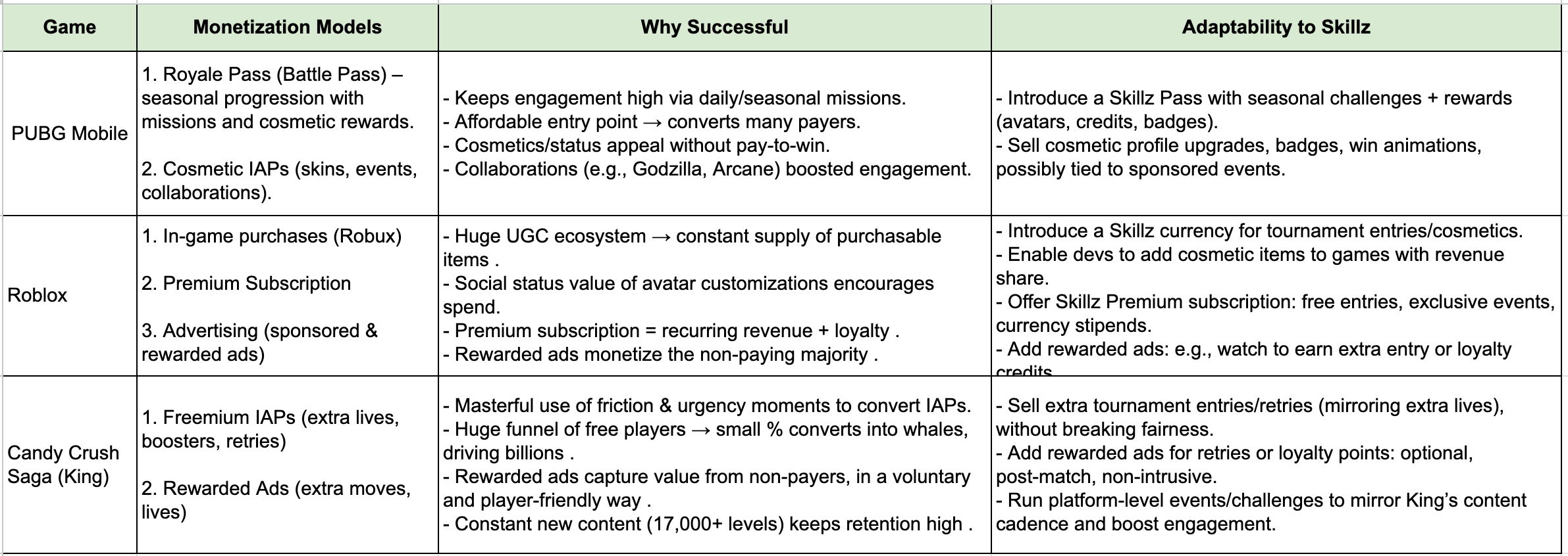 For a competitive platform like Skillz, Candy Crush’s strategies highlight ways to monetize casual players and retain users, which could be adapted in a skill-gaming context: