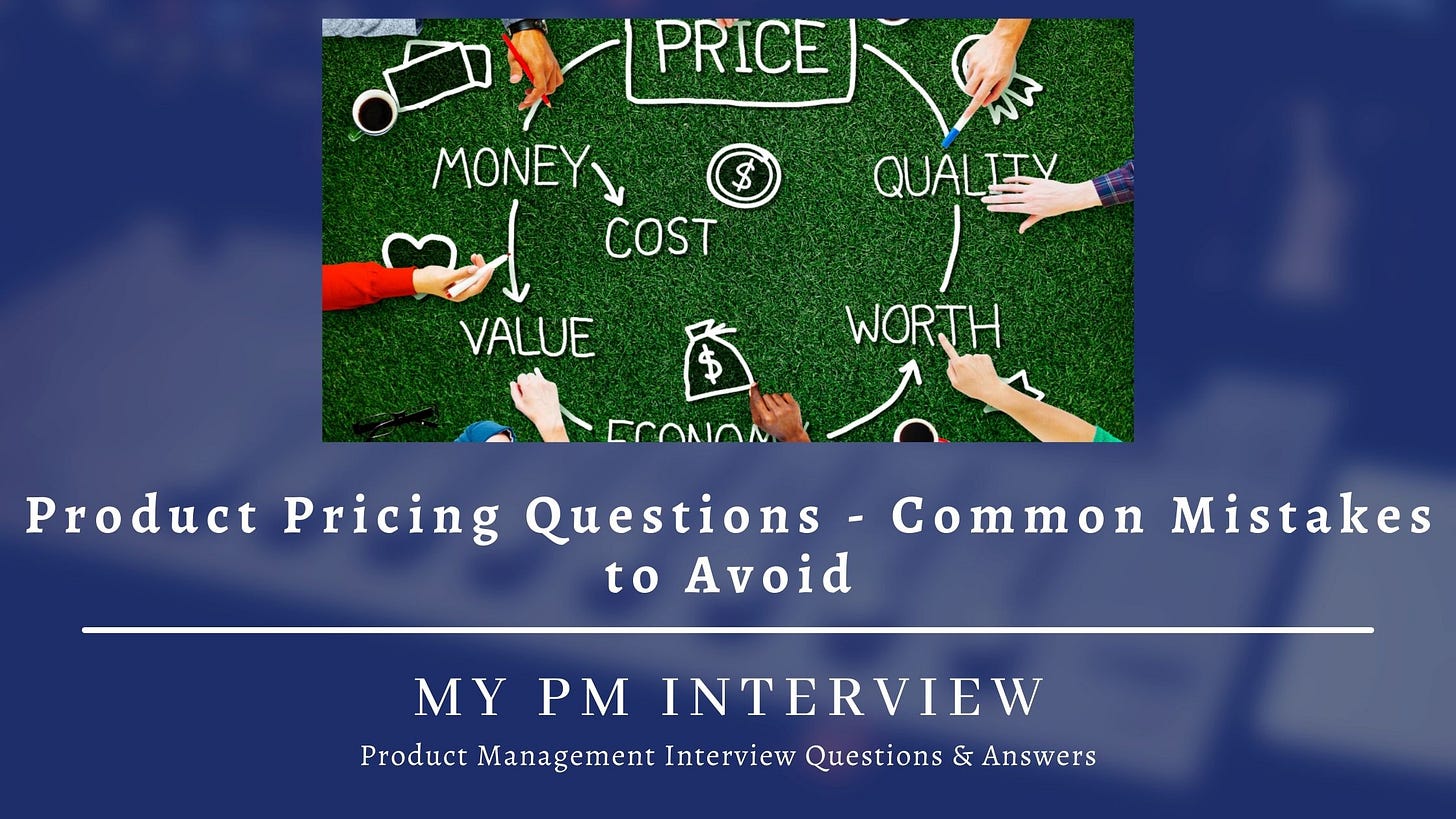 Product Pricing Questions - Common Mistakes to AvoidCommon Mistakes to avoid while Answering Product Pricing QuestionsMy PM InterviewJul 20, 2021∙ Paid1ShareHere is a list of common mistakes which people make while answering product pricing questions:1. Not providing an overview of the product and industry Your pricing strategy is driven by the product a…This post is for paid subscribersSubscribeAlready a paid subscriber? Sign inPreviousNext