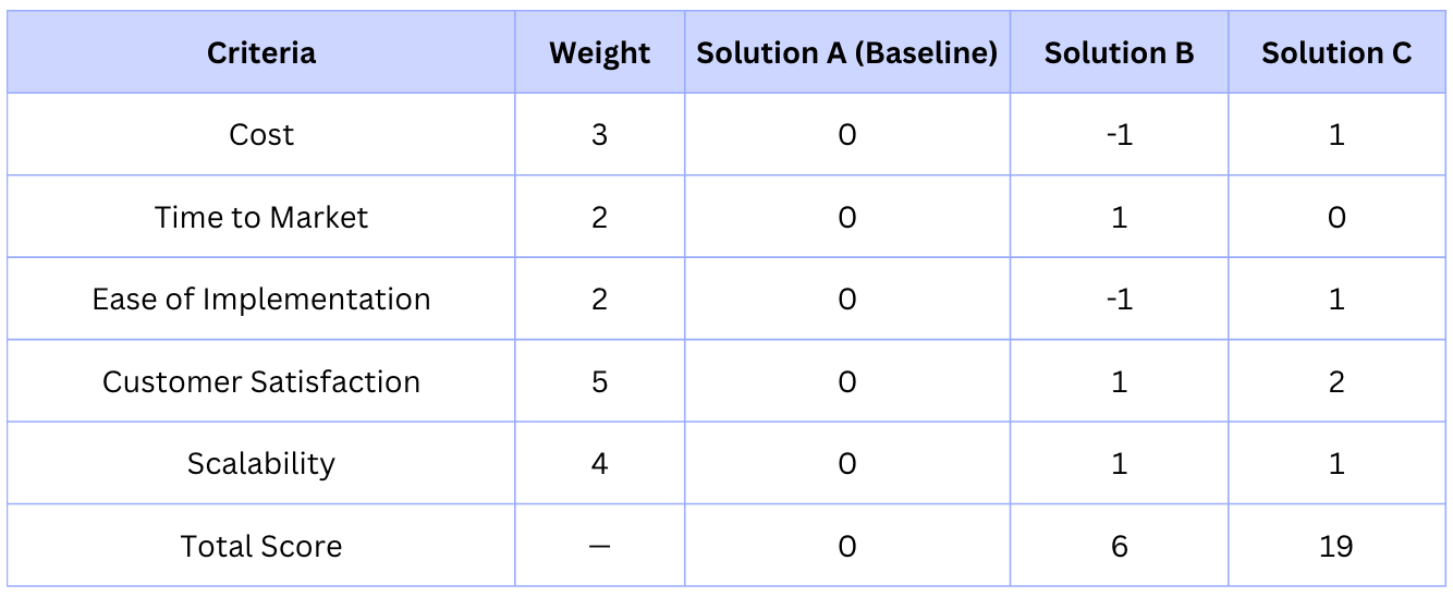 Solution B scores better on time to market and customer satisfaction but worse on cost and ease of implementation.