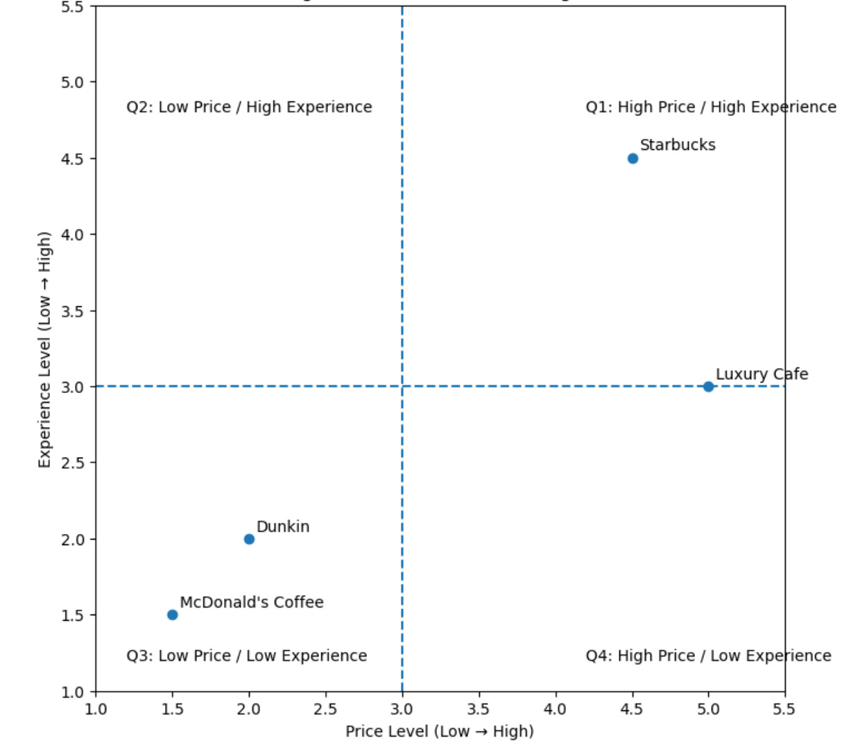 Starbucks intentionally positions itself at the high end of the market across three dimensions: